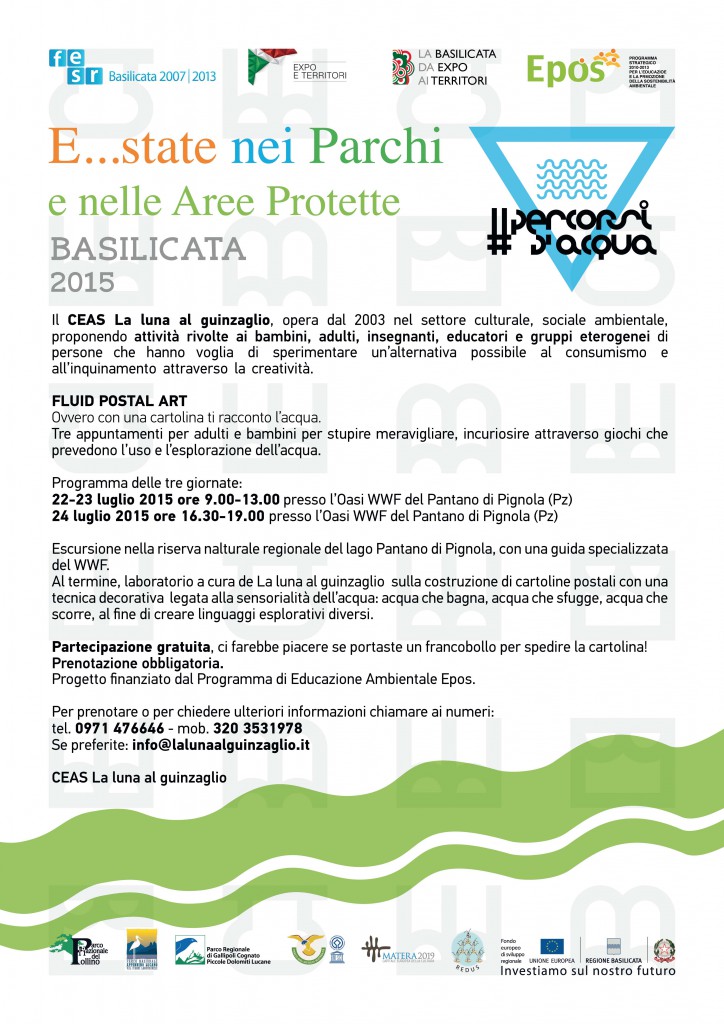 Nell’ambito dell’iniziativa E…state nei Parchi e nelle Aree Protette 2015 promossa dal Programma di Educazione Ambientale Epos Basilicata La luna al guinzaglio organizza diversi laboratori fra cui un appuntamento pomeridiano dedicato a bambini e adulti per stupire, meravigliare e incuriosire attraverso giochi che prevedono l’uso e l’esplorazione dell’acqua. Programma 24 luglio 2015 ore 16.30-19.00 presso